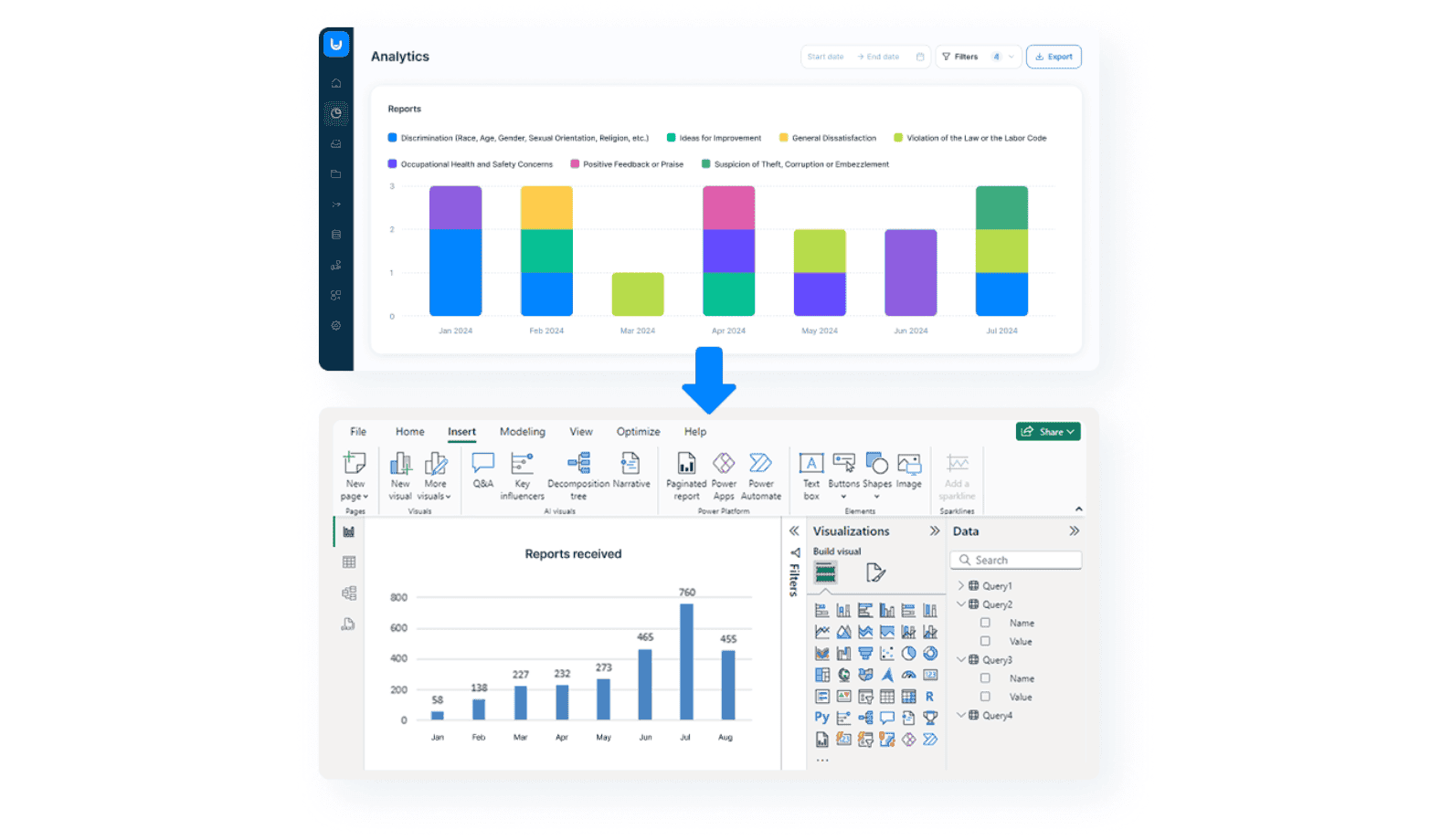 Cross-departmental analytics shows how training, restructuring, or operational changes affect reporting behavior using Power BI visuals and governance dashboards. Automated alerts help detect emerging risk clusters before they reach regulatory or reputational thresholds.